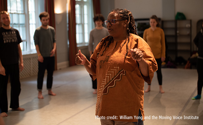 Arrivals Legacy Voice workshops tap into embodied vocal techniques centred on participants’ ancestral sources. Drawing on rhythmic and call and response patterns, and rooted breath voice and body techniques, this workshop can range from a 1-day online offering to 3-5 days in person. Led by Diane Roberts and a team of co-facilitators.